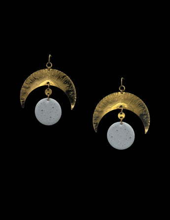 Inspired by the celestial dance of the moon and sun, these earrings capture the mystery and beauty of an eclipse. Hand fabricated, they feature moissanite set in place within glossy enamel, with bold circular forms that sparkle in shifting light and shadow. The design evokes cycles of transformation and renewal, offering a striking balance of simplicity and symbolism. Elegant yet powerful, the Eclipse Moon Earrings are a wearable reminder of the cosmos in motion. A glittering of Moissanite set in white enamel and 14k gold double clad gold-fill 2.5"x2.5"